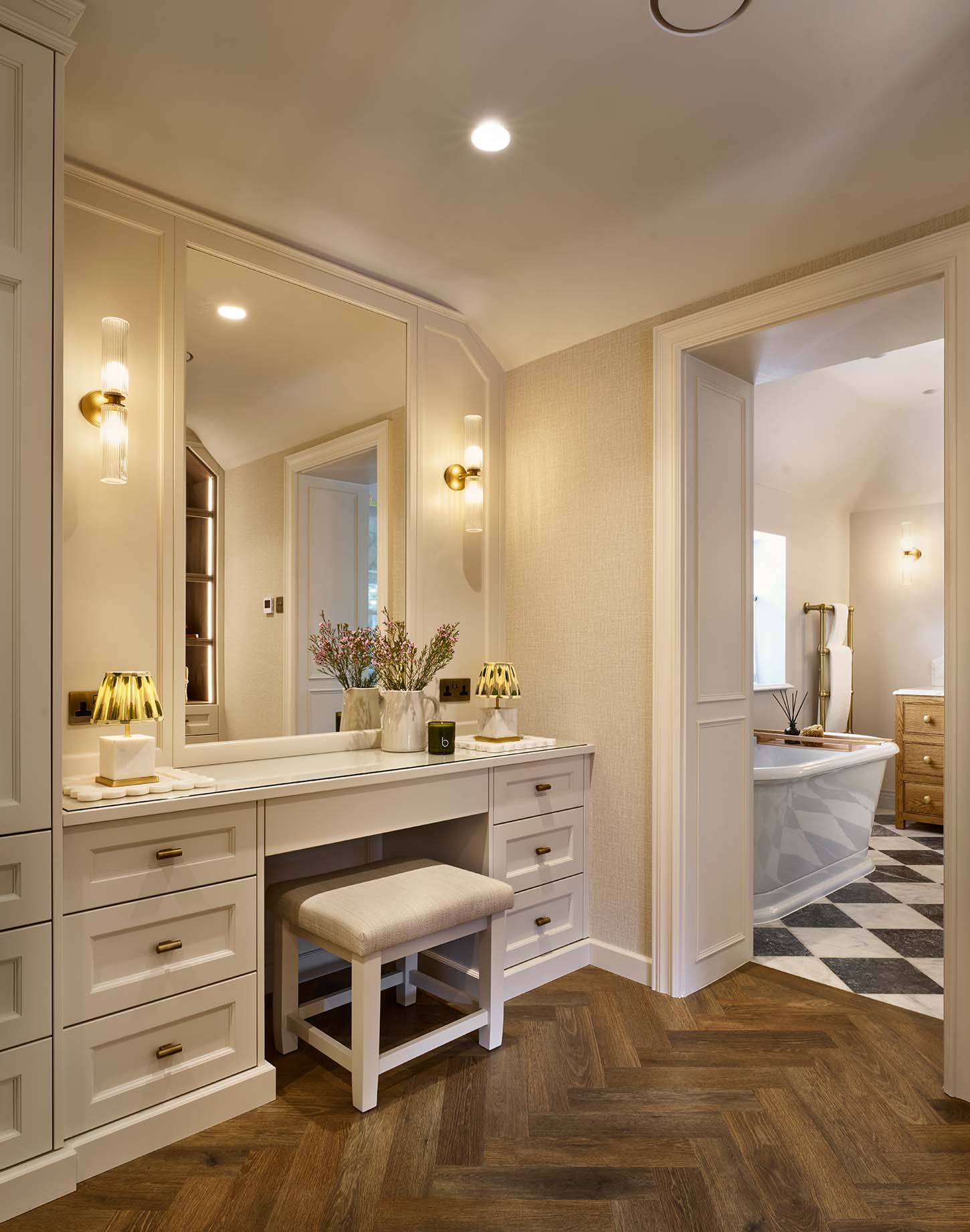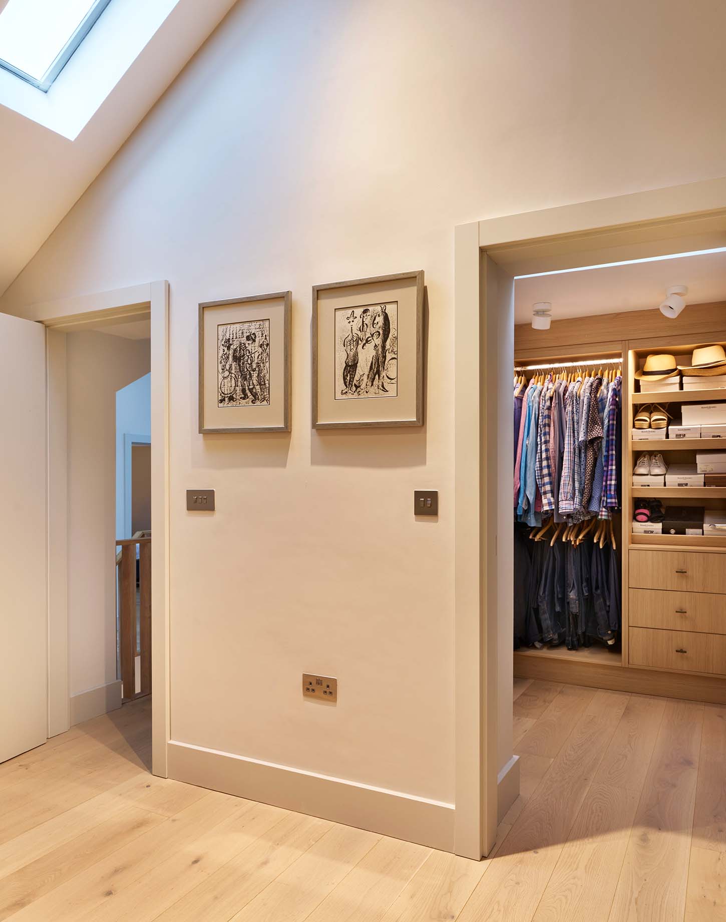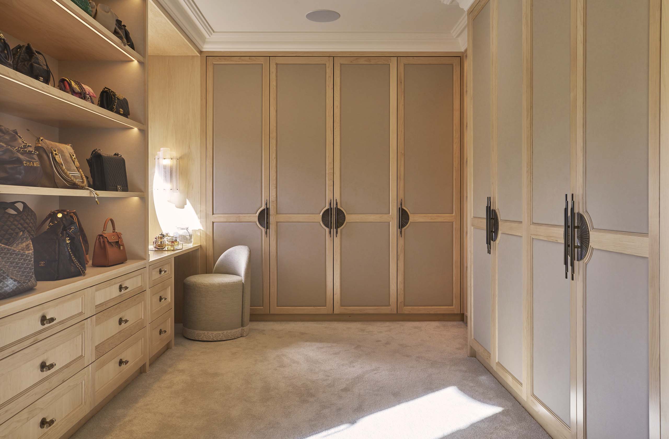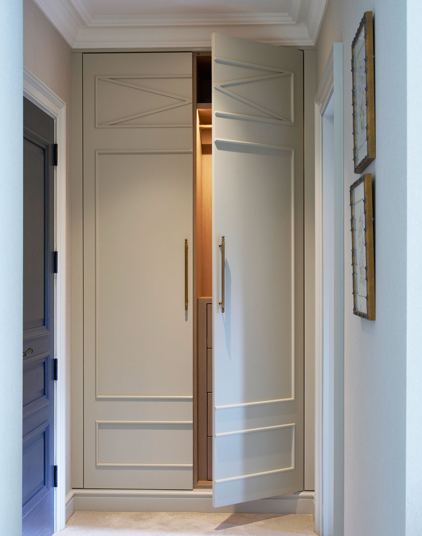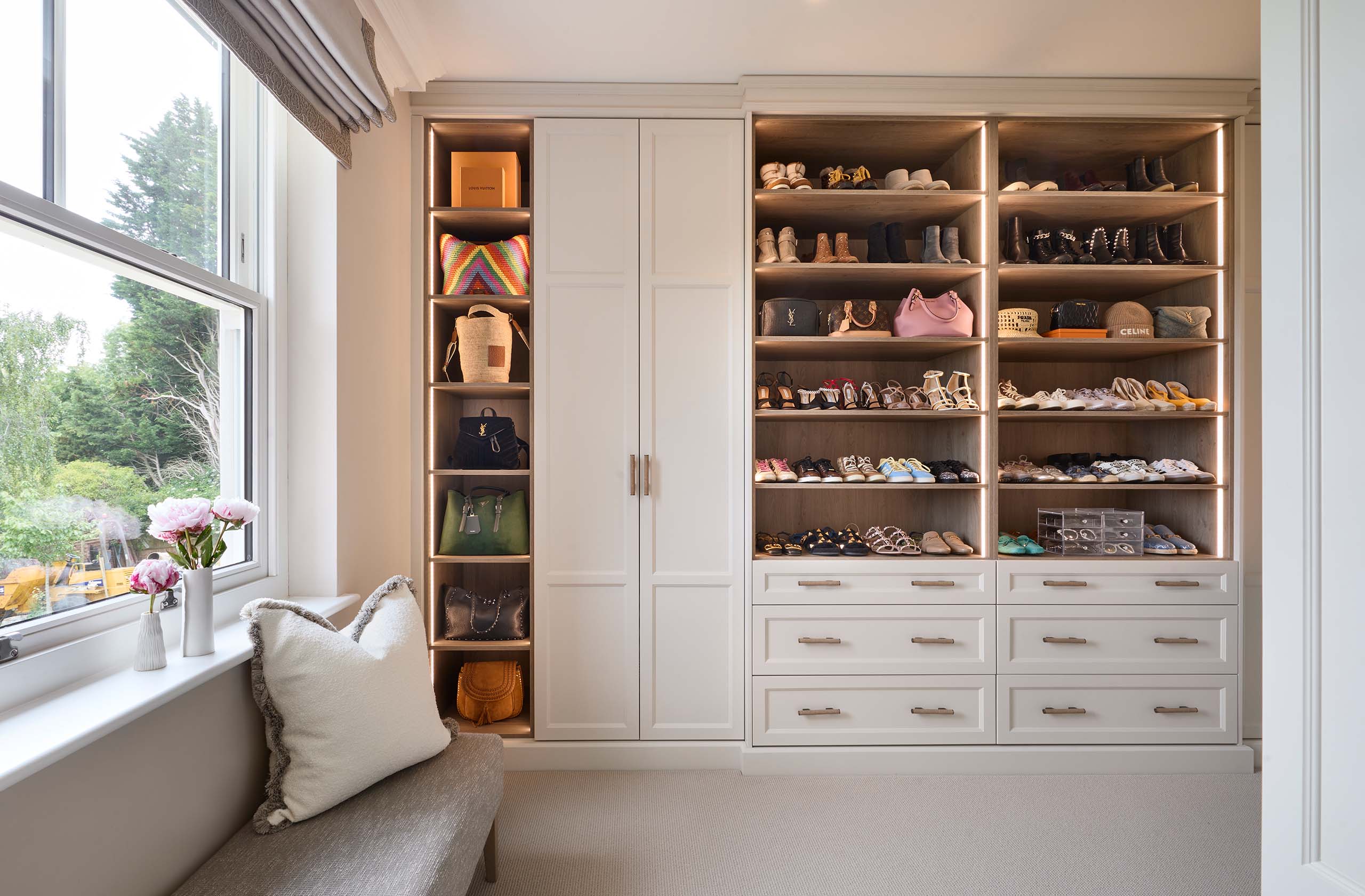 Fitted wardrobes can be designed without doors for ease of access in dressing rooms. Various types of storage such as drawers and shoe shelves can help to organise clothes and accessories, whilst lighting can help to highlight certain areas as well as create a beautiful ambience.
