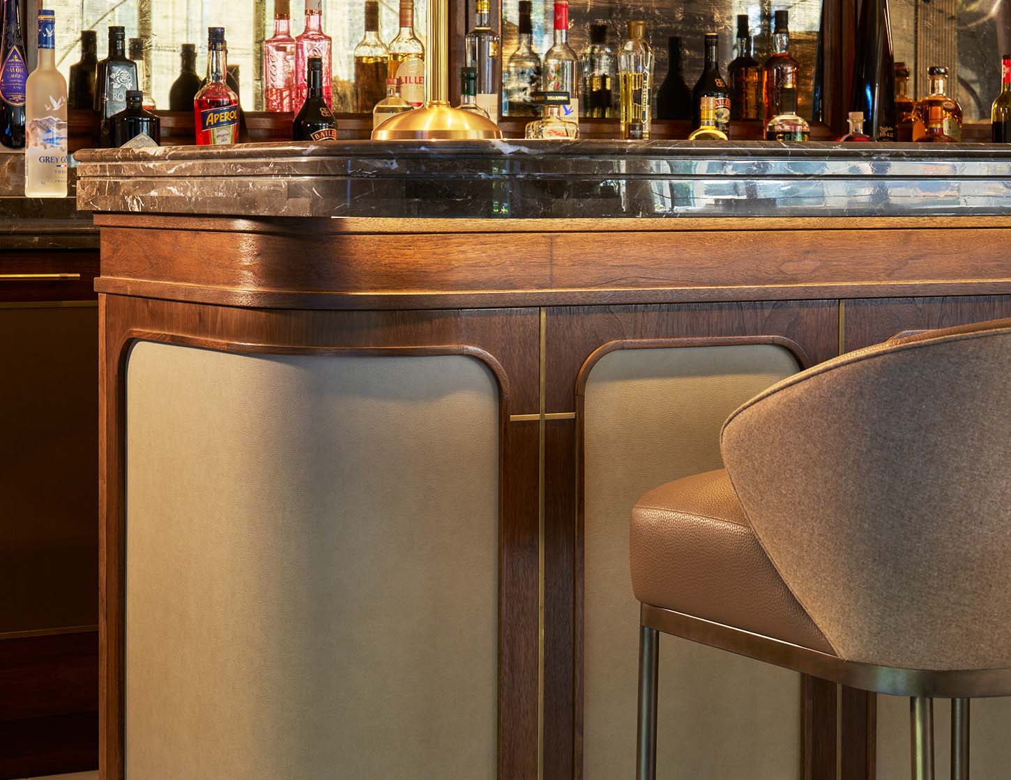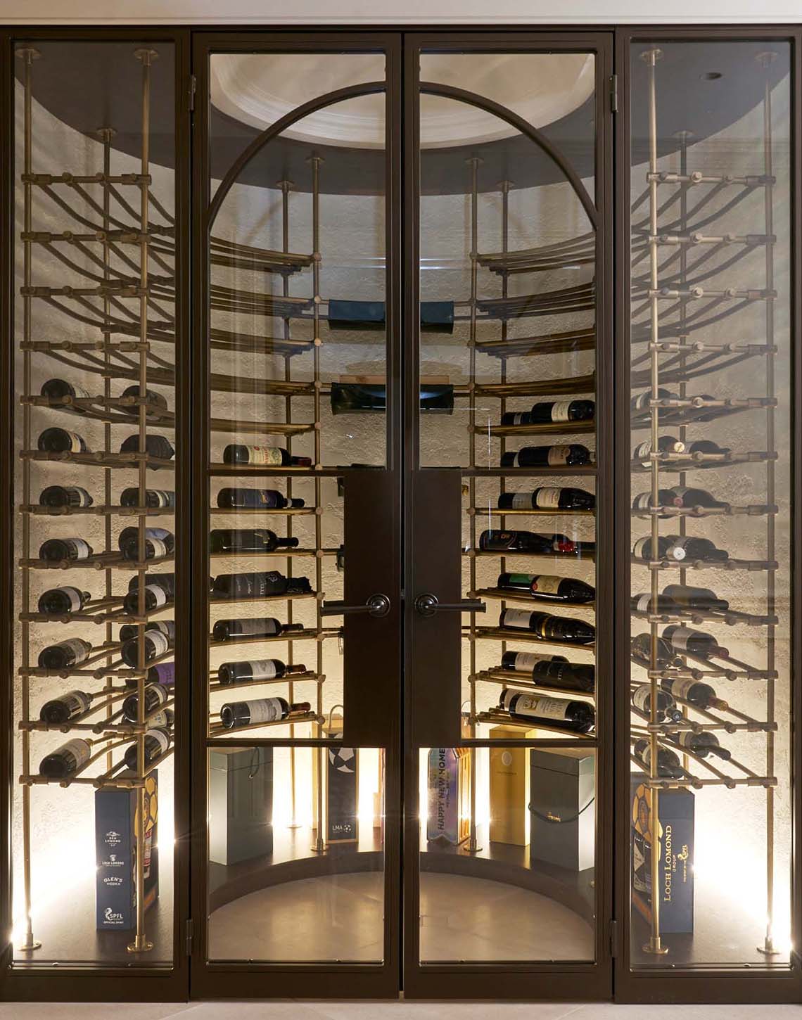 The back panels are finished in Venetian plaster, introducing a subtle texture and tonal softness that contrasts beautifully with the precision of the metalwork. Soft, integrated lighting enhances this surface, allowing the bottles and brass framework to stand forward while creating depth and atmosphere. Low-level illumination further accentuates the curvature of the space, producing a gentle, ambient glow.