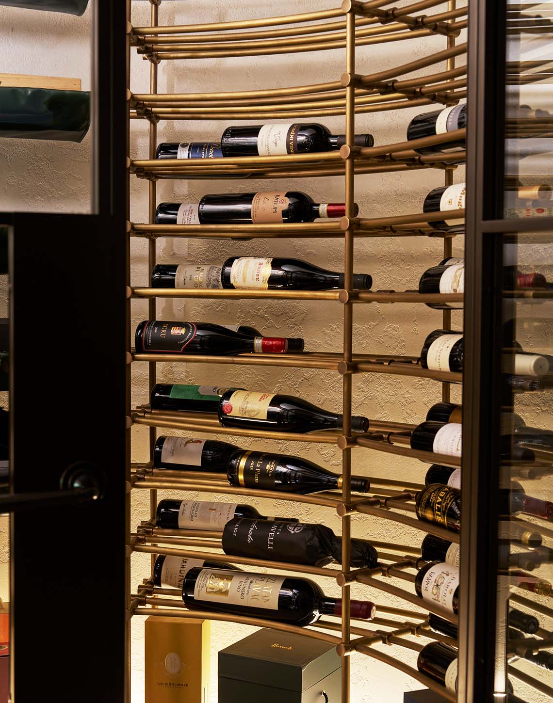 Antique brass wine racking forms the defining element, its linear framework introducing rhythm and repetition while providing a precise, engineered structure for bottle storage. The warm, brushed finish of the brass complements the depth of the walnut, establishing a cohesive and sophisticated material palette.