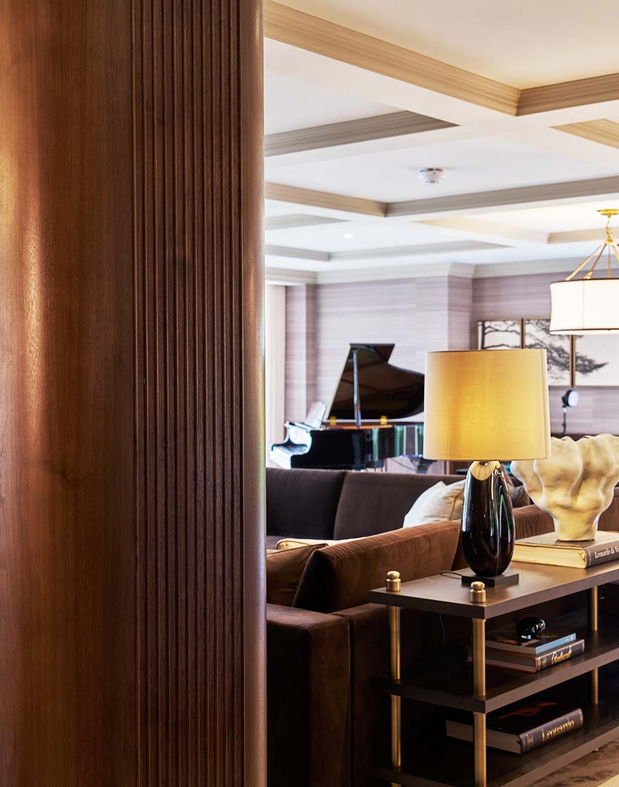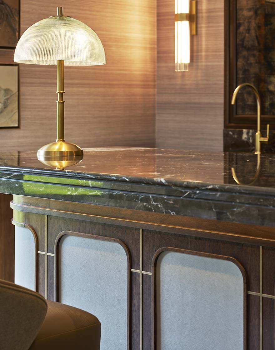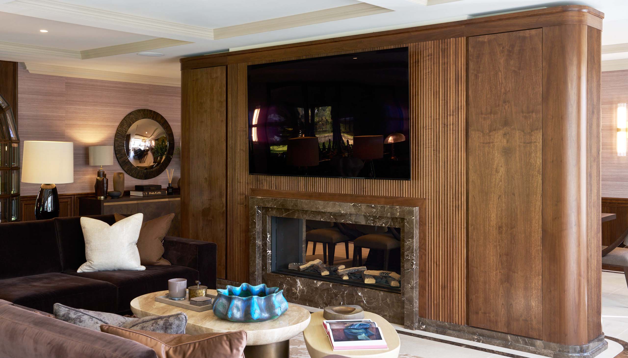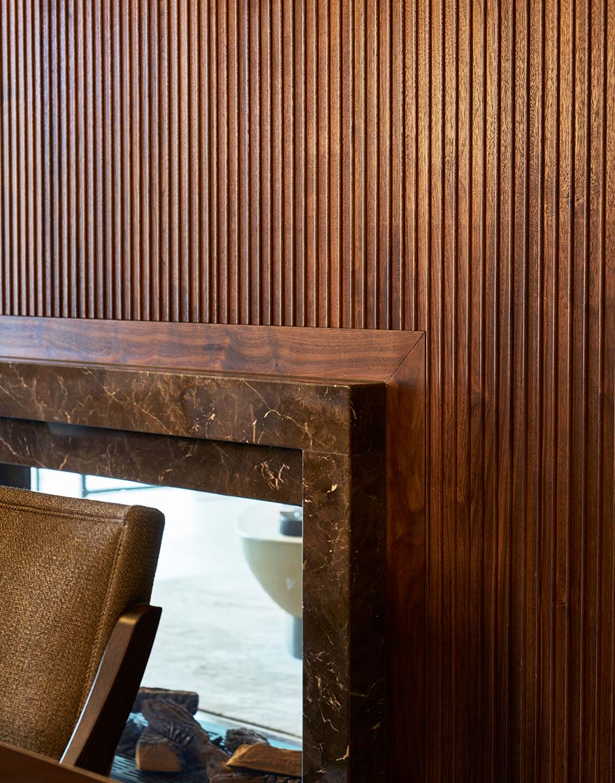 Crafted in rich American Black Walnut, the media wall establishes warmth and continuity, wrapping the space with a sense of cohesion and permanence. Fluted vertical panels introduce rhythm and subtle movement, softening the clean-lined form while adding depth and texture to the overall composition. A large, inset screen is seamlessly integrated above a statement fireplace, framed in Oriental Brown marble – its tonal variation echoing the material palette of the adjoining bar.