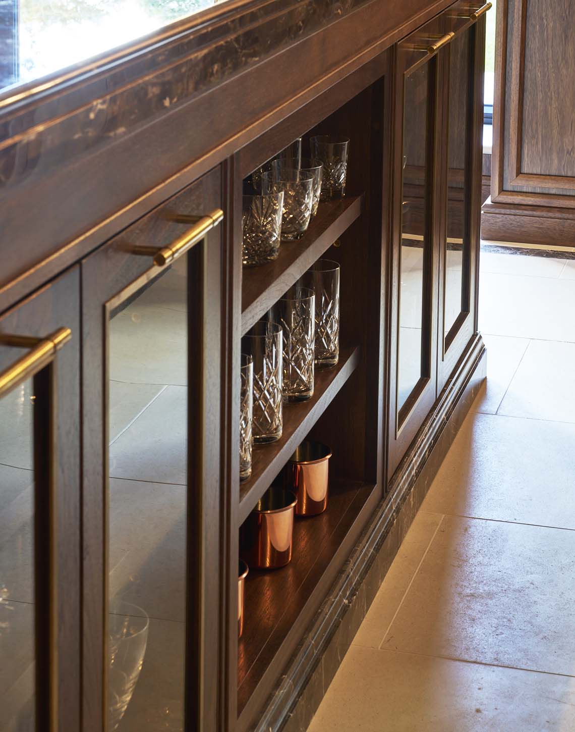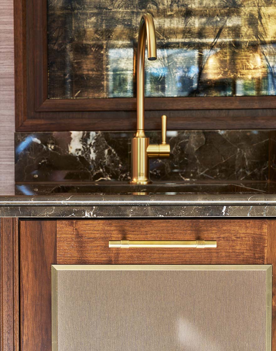 Cabinetry is crafted in American Black Walnut, using a combination of solid timber and veneers to achieve depth, durability and consistency. Antique brass detailing is integrated throughout, most notably within the bespoke wine racking, while antique bronze mirrored panels and Venetian plaster finishes introduce texture and contrast.