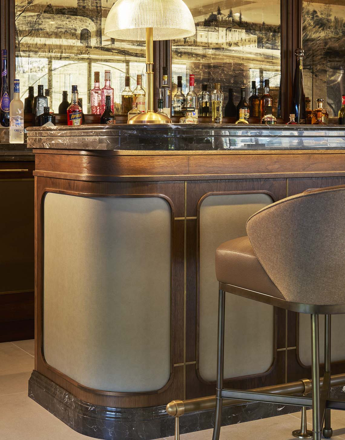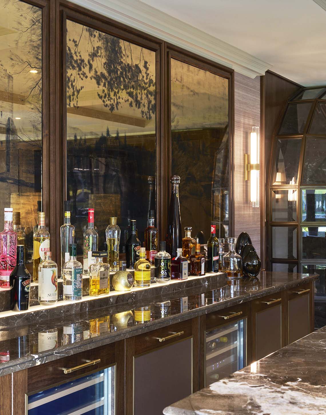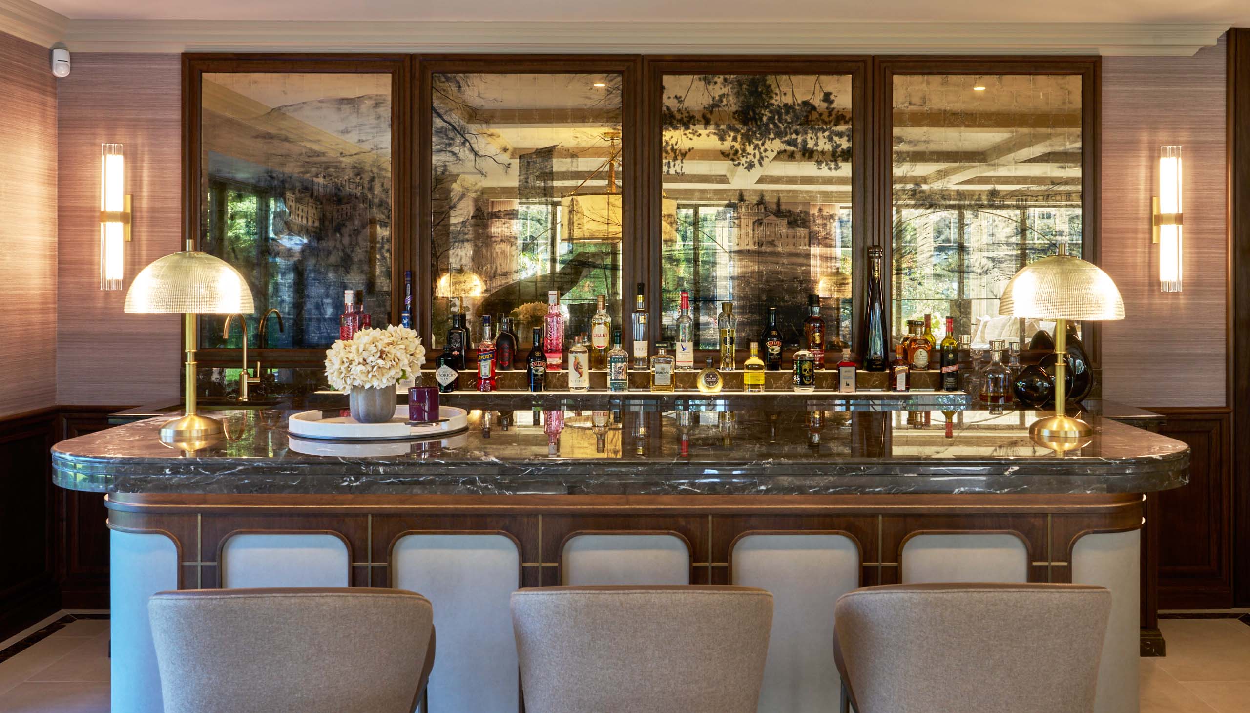 At its heart sits a fully integrated drinks bar, framed in rich American Black Walnut timber cabinetry that immediately establishes warmth and depth. The back bar is carefully layered with antique bronze mirrored panels and softly illuminated shelving, creating a sense of atmosphere while subtly reflecting light and movement across the room. An Oriental Brown natural marble worktop introduces contrast and durability, anchoring the setting with a tactile, premium finish.