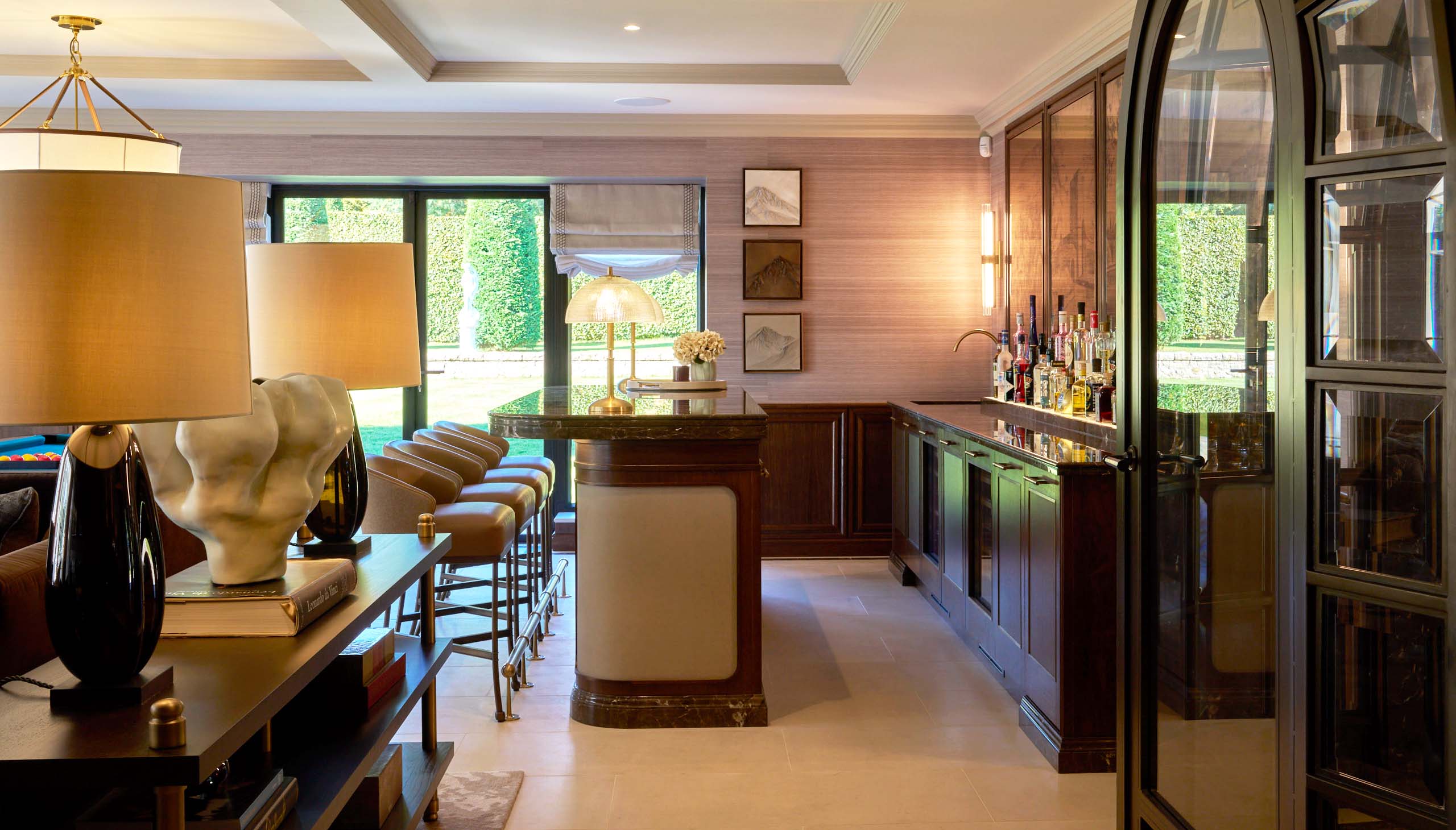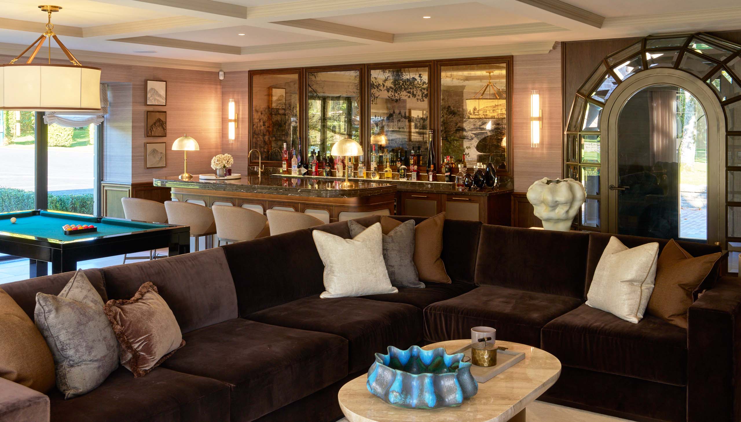 The space transitions effortlessly into a leisure setting, with a centrally positioned pool table and a relaxed seating area beyond. Upholstered bar stools and deep, tailored sofas soften the scheme, ensuring the room feels as comfortable as it is visually striking.