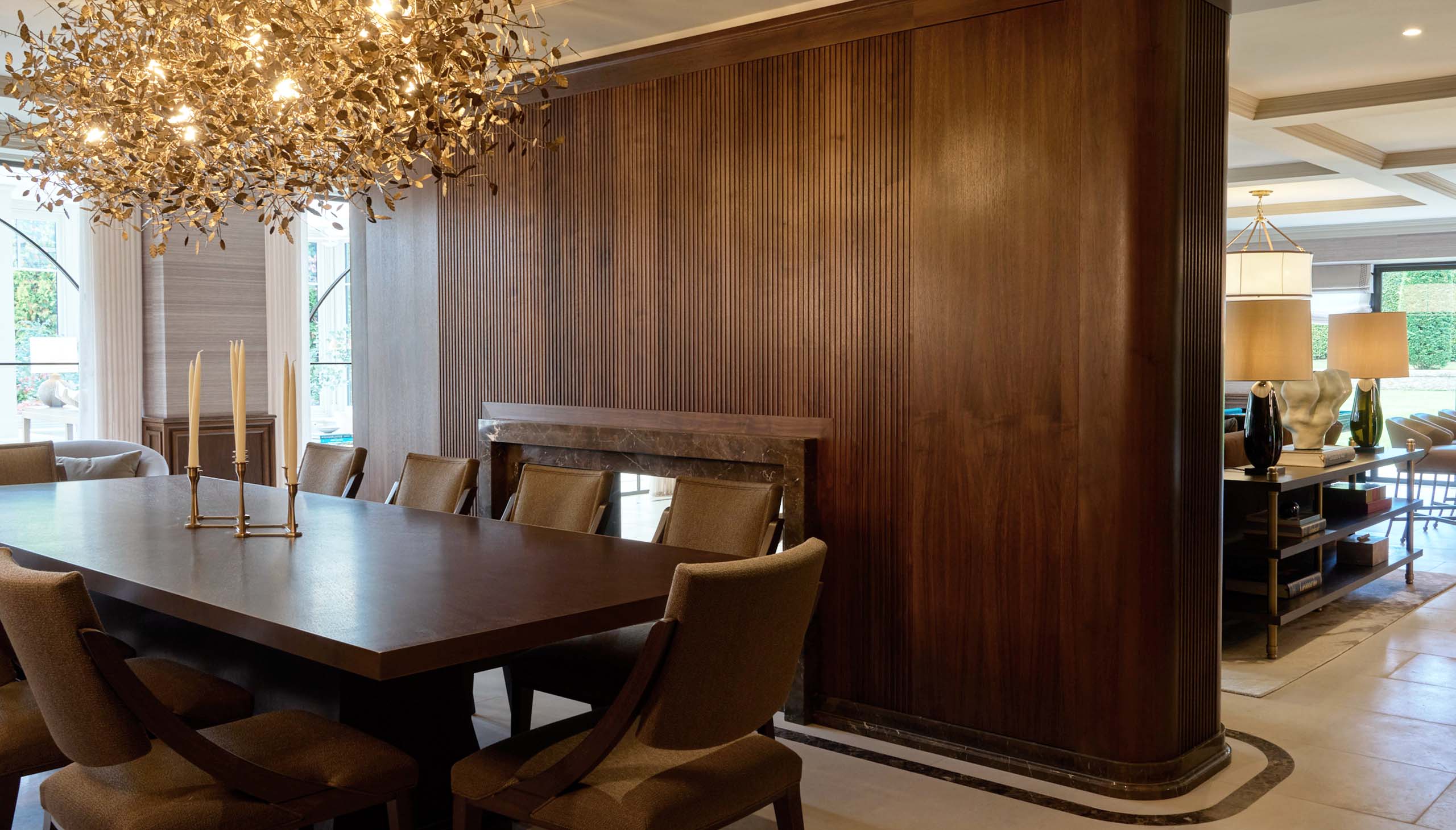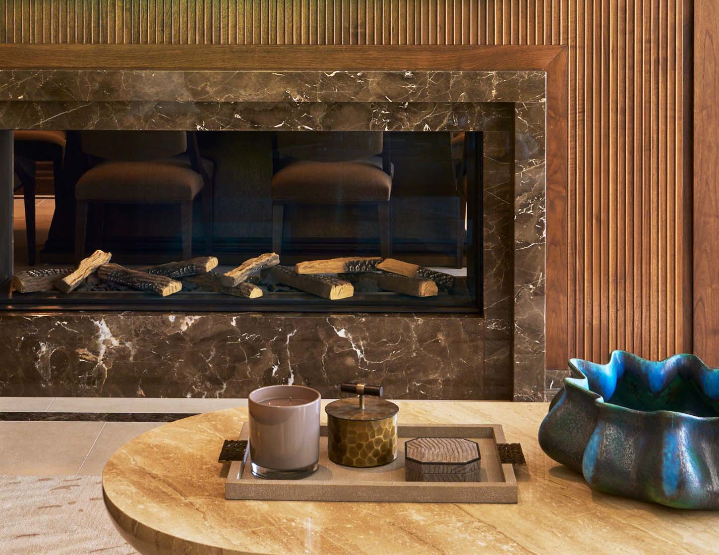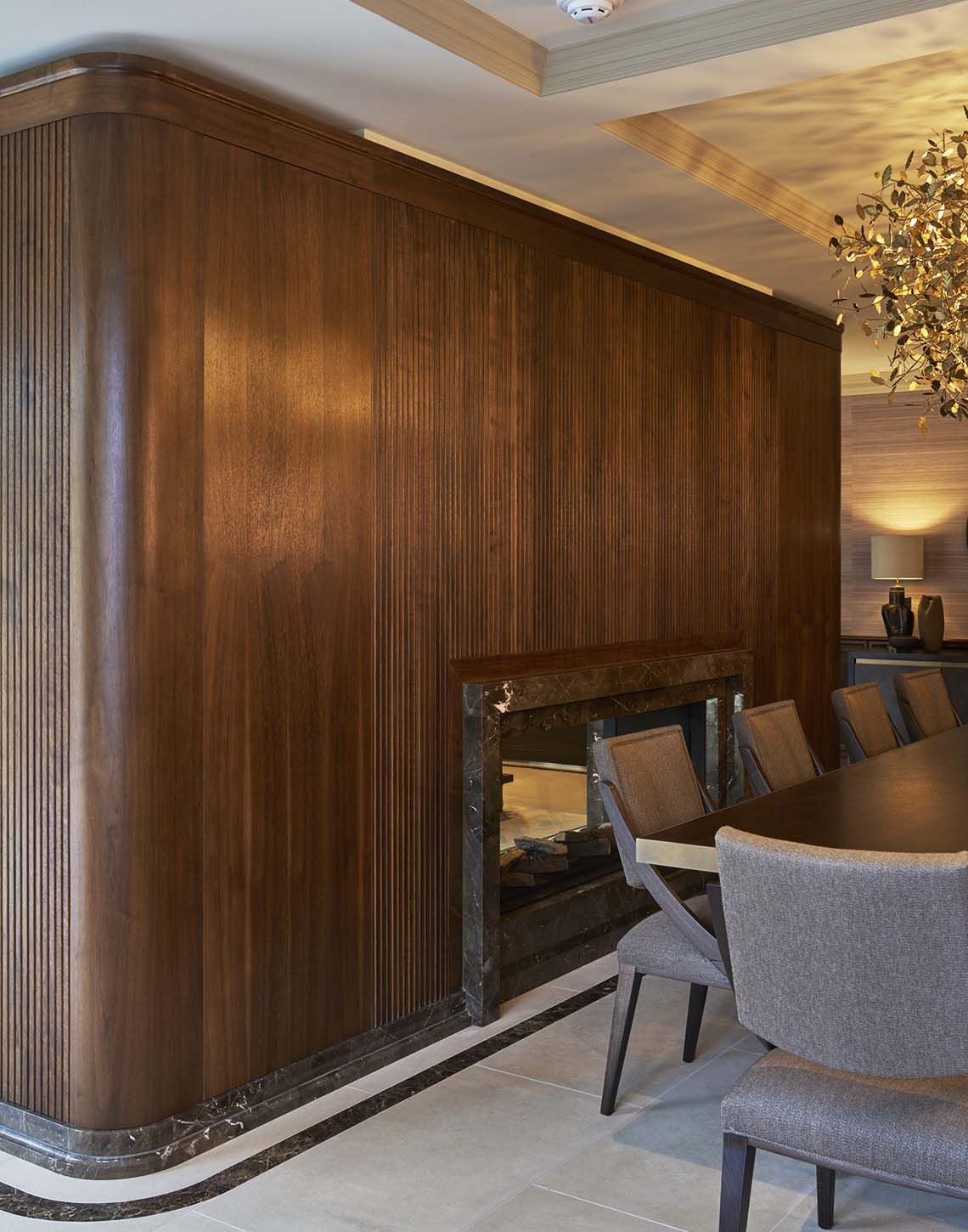 A defining feature of the space is the bespoke American Black Walnut architectural wall, which seamlessly integrates a double-sided fireplace. One side presents as a fluted surface, its vertical rhythm adding texture and depth, while the opposing face reveals a precisely framed opening in Oriental Brown marble—introducing contrast and a tactile focal point within the dining area.