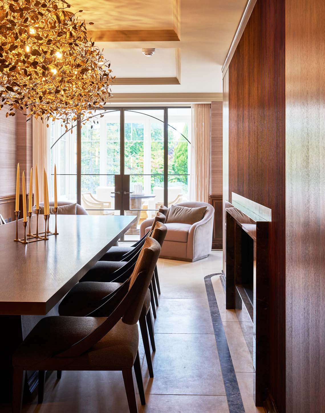 Perimeter wall panelling continues the language of classic proportions and fine detailing, grounding the space while adding depth and architectural interest. Layered lighting, including wall-mounted fixtures and decorative elements, works in harmony with the natural materials to create a warm, intimate environment suited to both formal dining and relaxed entertaining.
