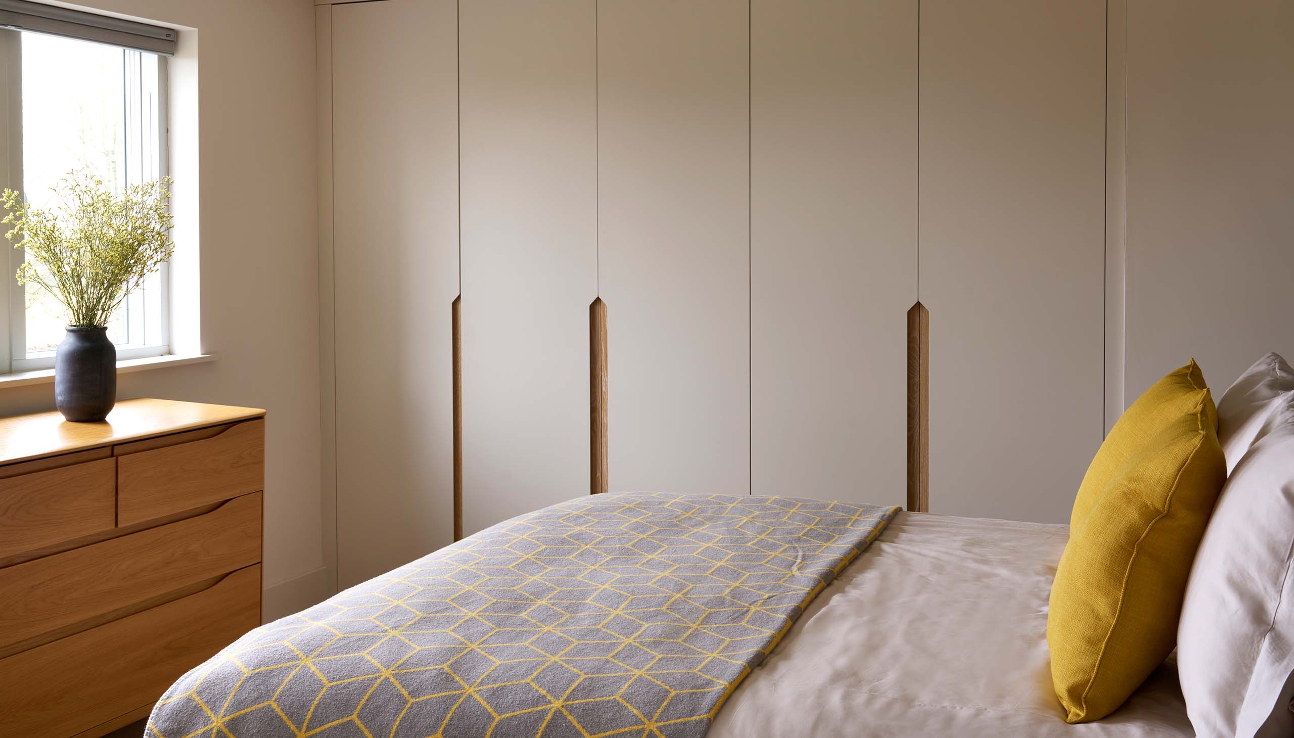 Full-height fitted wardrobes create a seamless wall of storage, finished in a soft, muted tone to maintain a calm and uncluttered feel. Integrated timber insets form subtle recessed handles, introducing warmth while preserving the handleless aesthetic.
