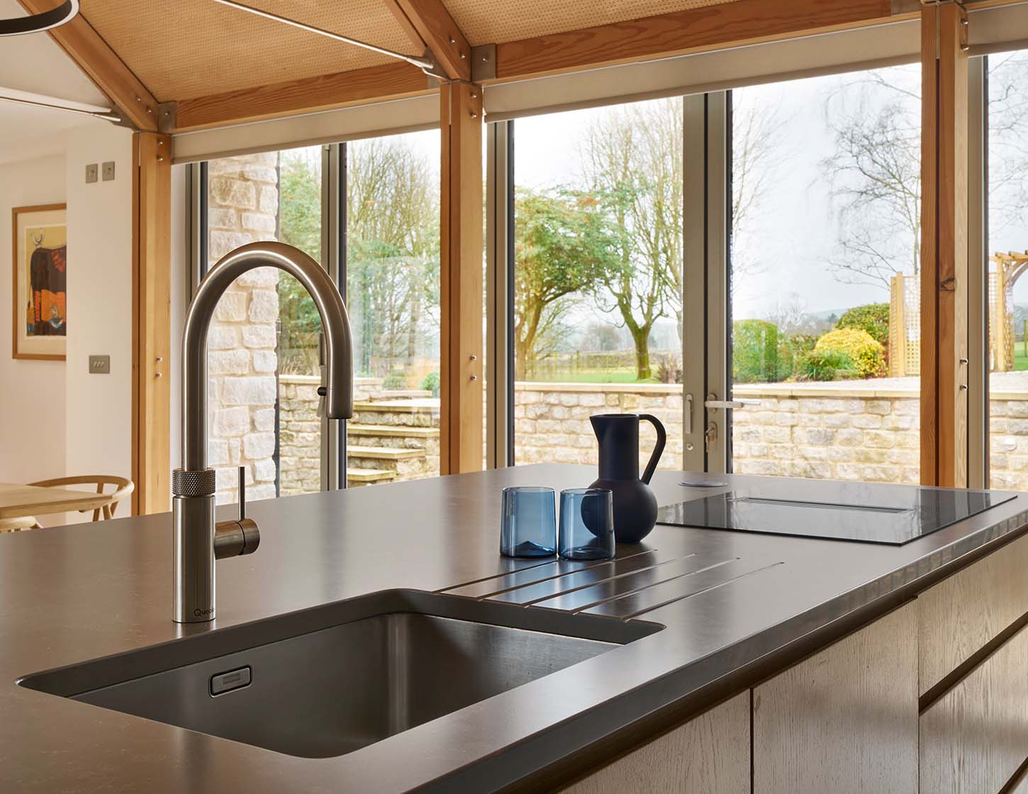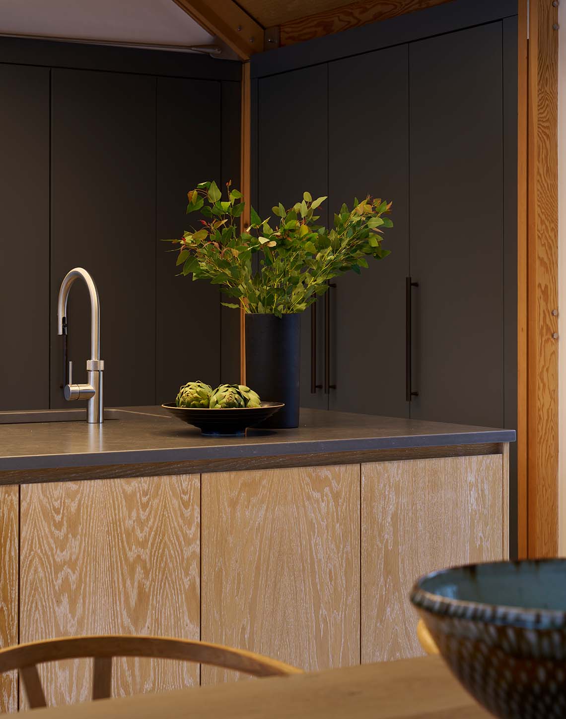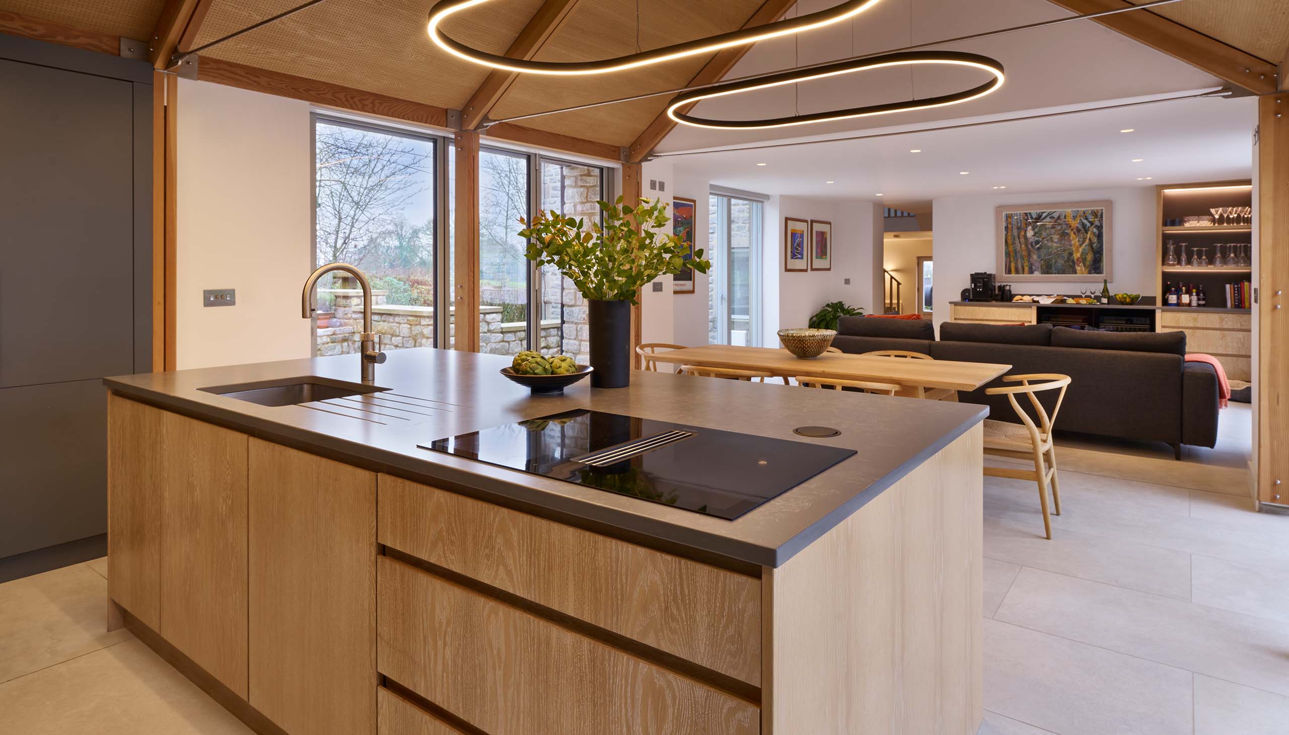 Materials are carefully selected to balance performance with natural beauty. Cabinetry is crafted from European oak, combining solid timber and veneers, with limed oak used across the cabinetry and island to introduce a soft, textured warmth.