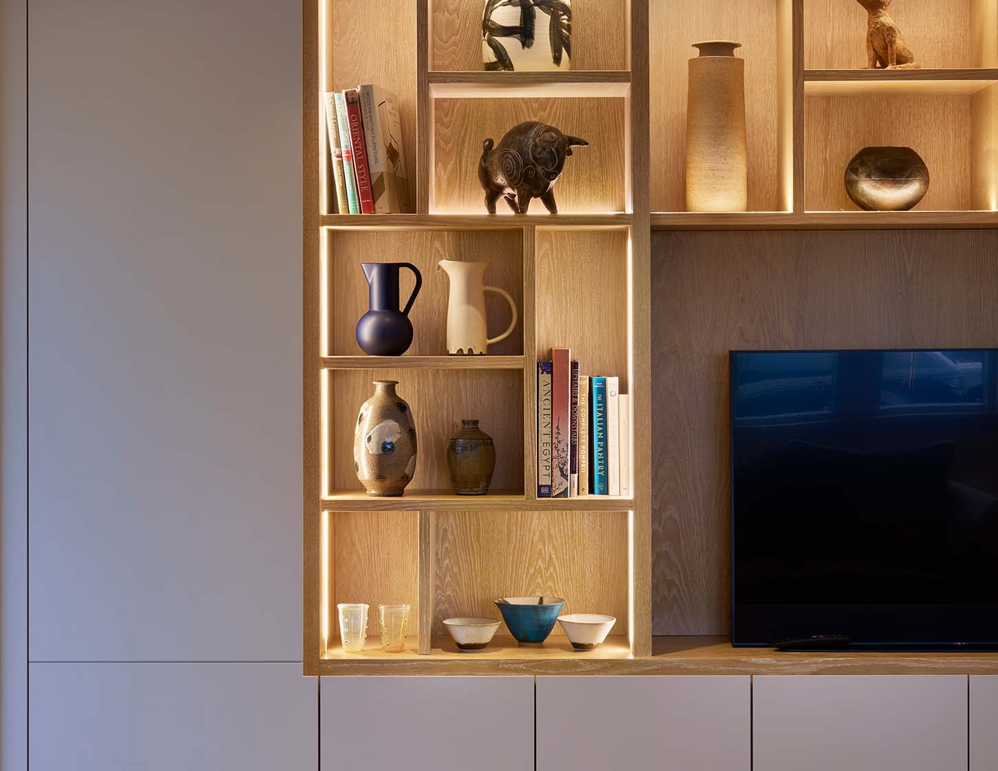 Framed in patinated European oak, open shelving introduces warmth and depth, with integrated lighting softly illuminating curated objects and books. The central recess houses the screen, set back to maintain clean lines and visual cohesion.