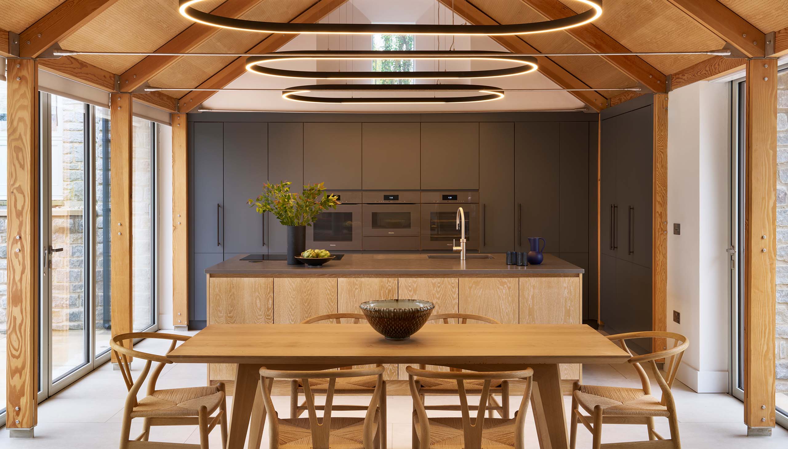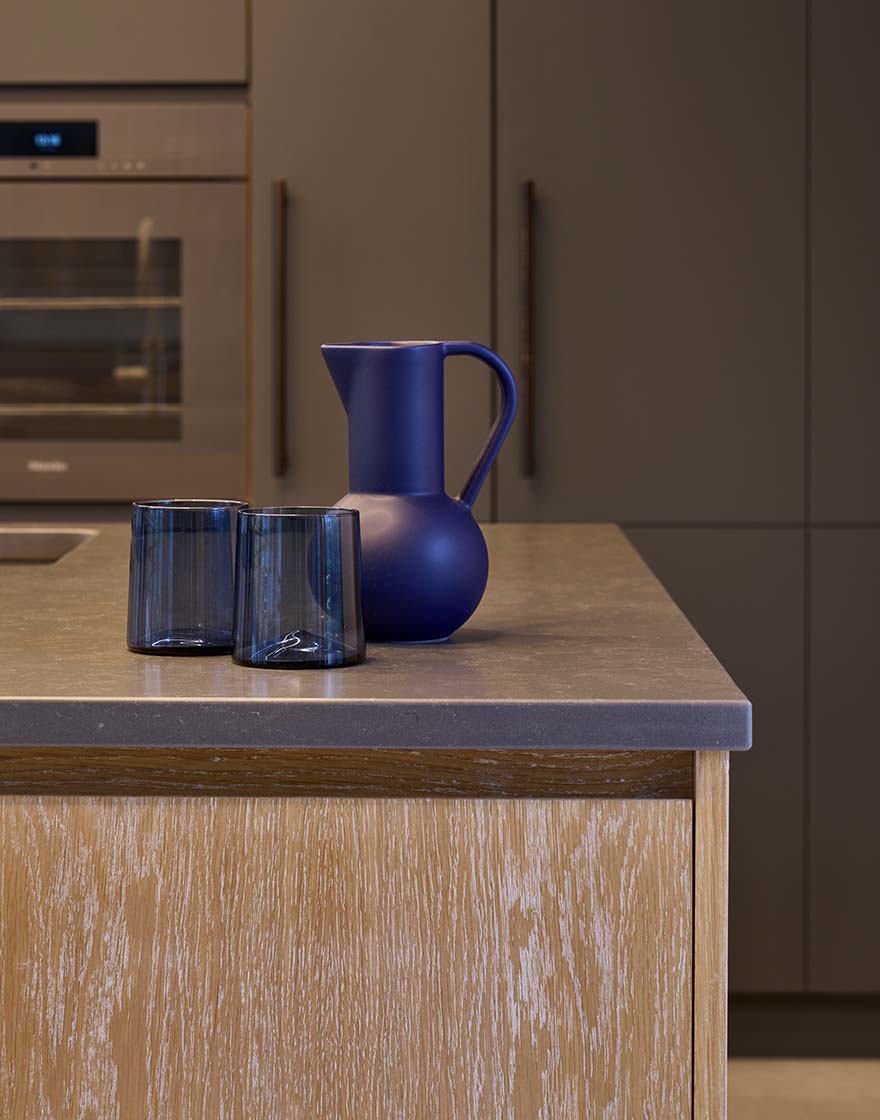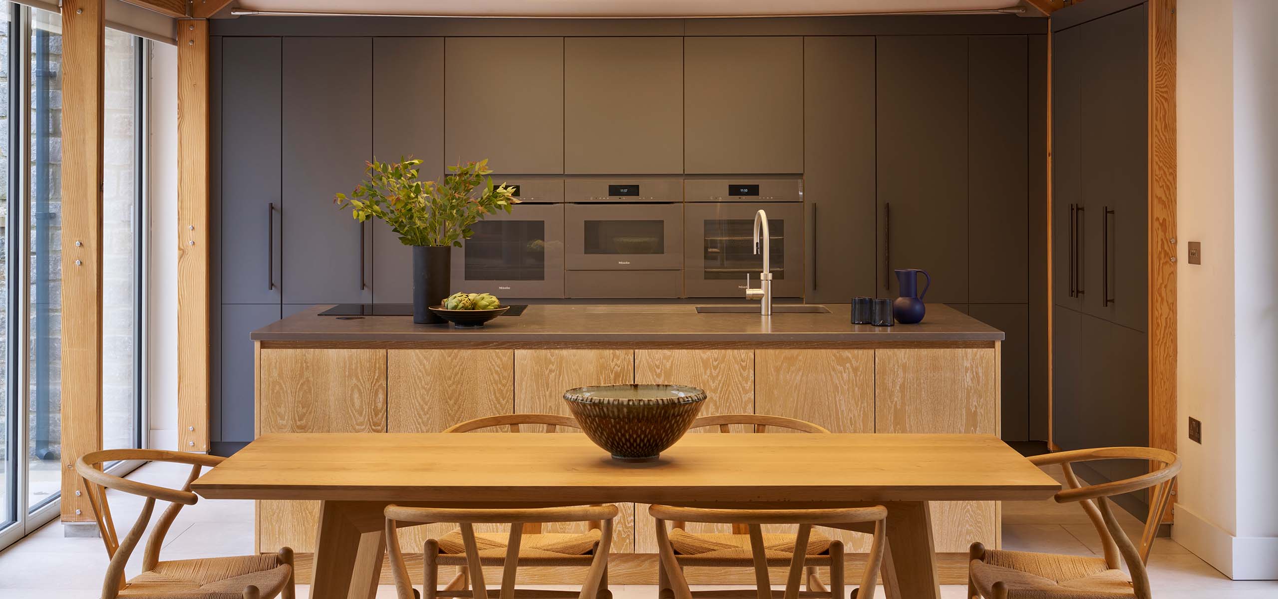 Detailing is precise and considered, ensuring functionality is delivered with the same refinement as the overall design. A suite of graphite grey Miele appliances are seamlessly integrated within the tall cabinetry, forming a strong focal point.