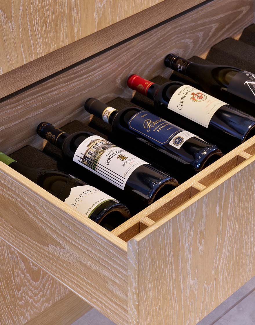 Set within a solid oak drawer, precision-cut divisions hold bottles securely in a horizontal position, while a cushioned inlay provides protection and subtle contrast. The patinated oak finish continues internally, maintaining warmth and consistency.