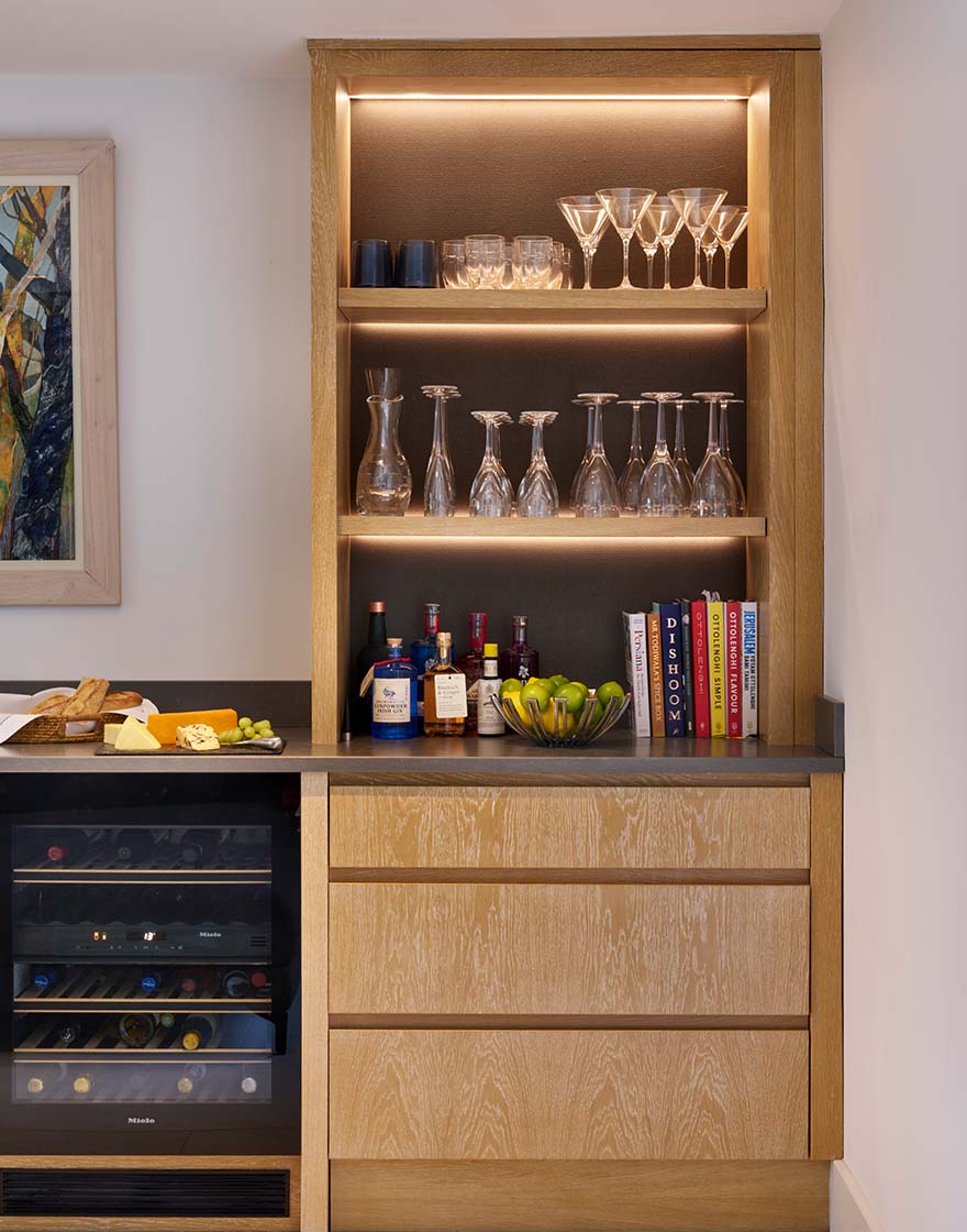 The drinks area is a natural extension of the kitchen, integrating preparation, entertaining and wine storage within a cohesive arrangement.