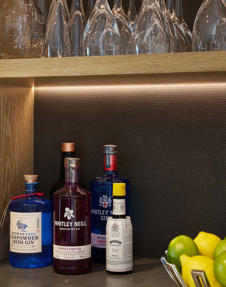 Above, illuminated shelving highlights glassware and spirits against a richly textured backdrop, adding depth, tactility and a subtle sense of theatre.