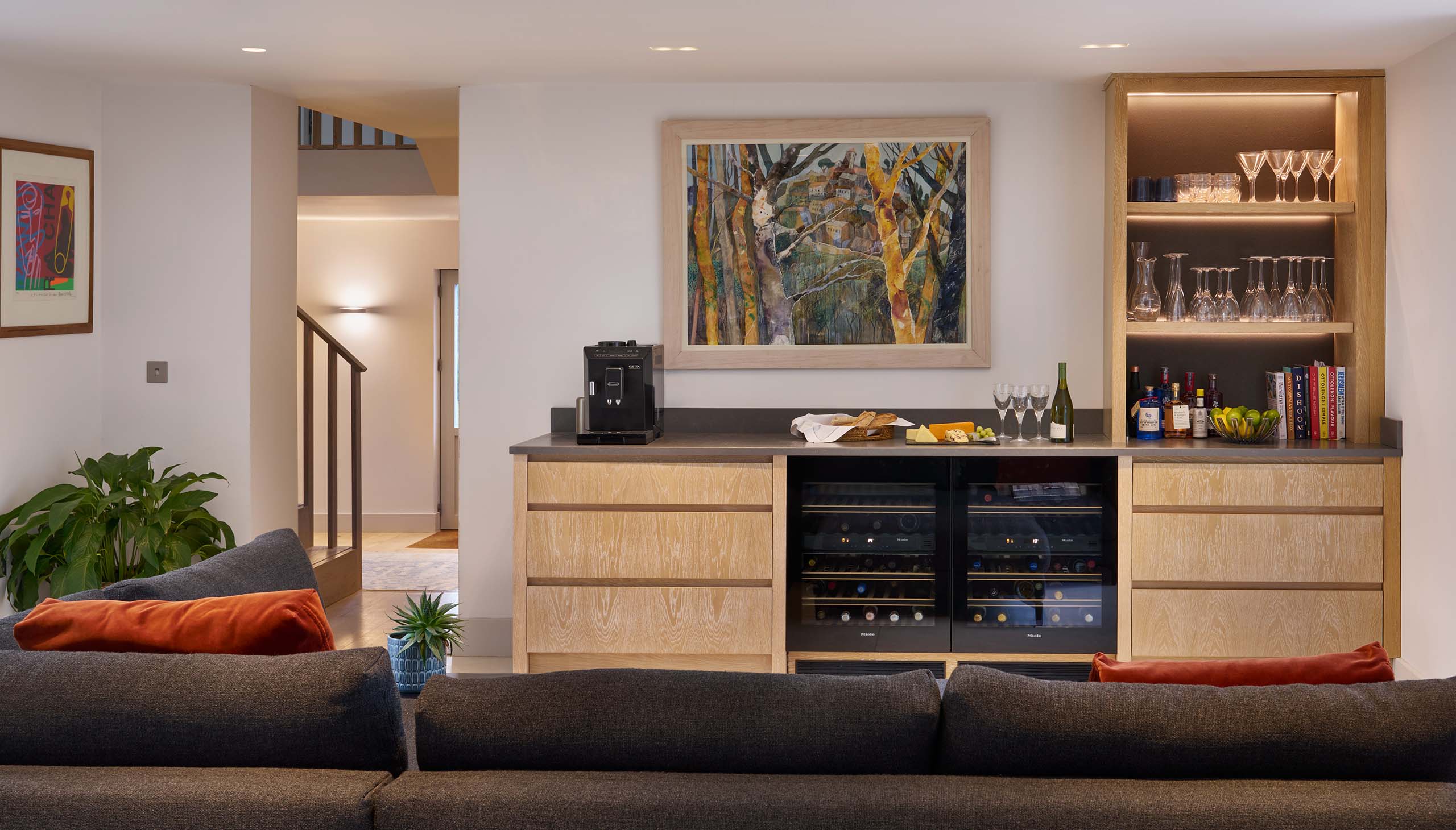 Crafted in patinated European oak, the cabinetry maintains continuity with the main scheme, while a stone work surface provides a refined serving space. At its centre, integrated Miele wine storage keeps bottles at optimal temperature and within easy reach.