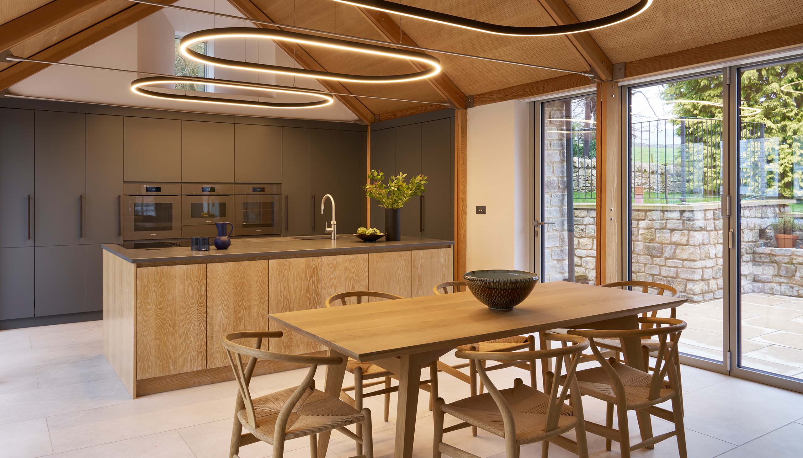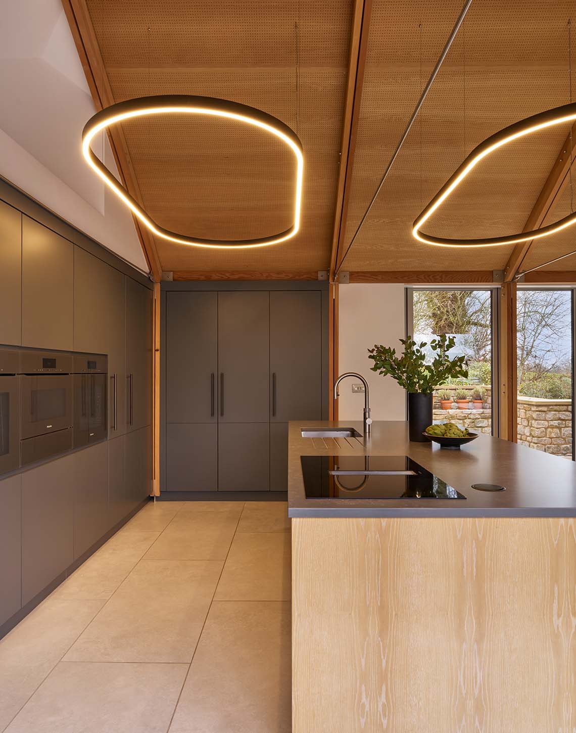 Set against a vaulted ceiling, exposed timber structure and sculptural lighting, the kitchen reads as a cohesive composition—timeless, understated and effortlessly elegant.