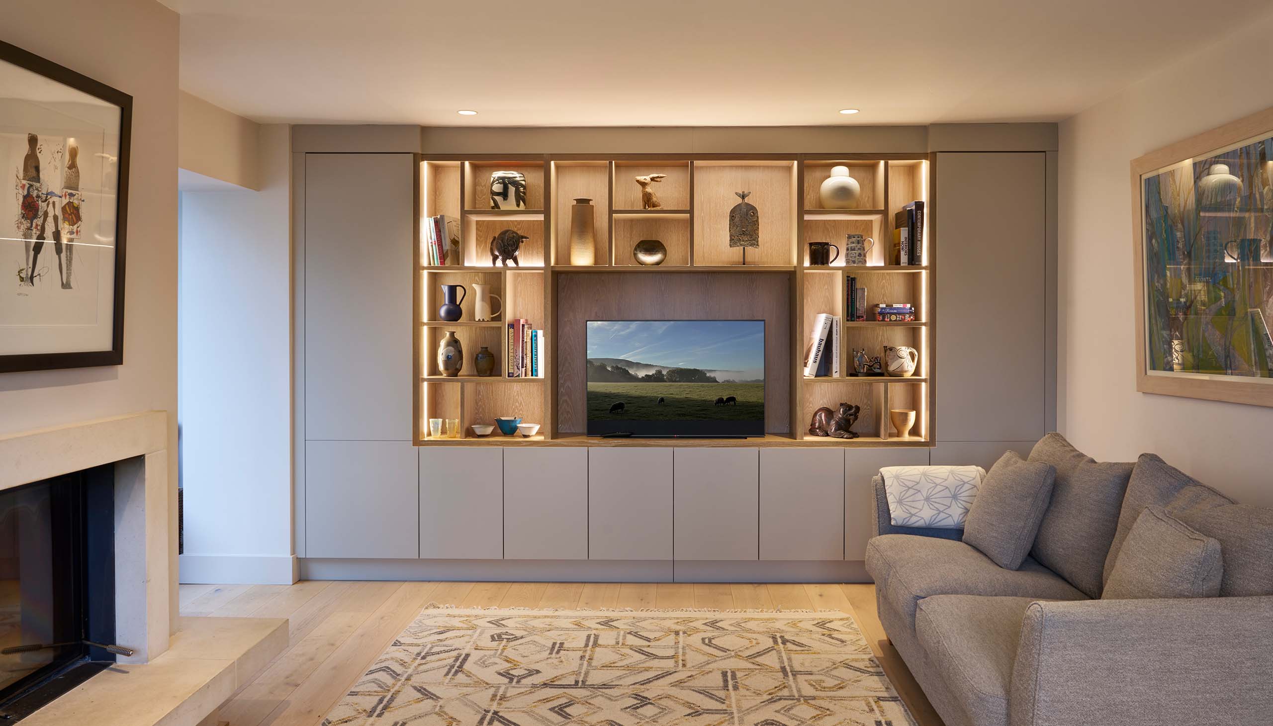 The media wall is designed as a calm architectural focal point, integrating storage, display and technology within a balanced arrangement.