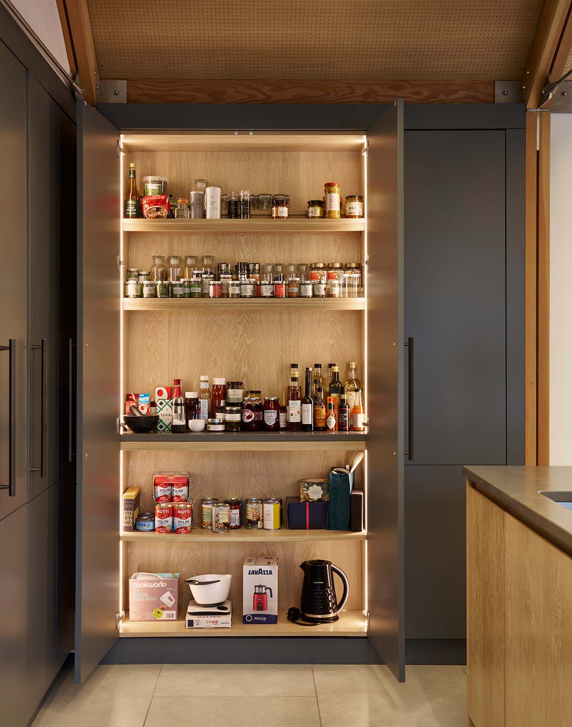 Integrated lighting enhances depth and atmosphere, transforming the larder from a functional element into a considered design feature.