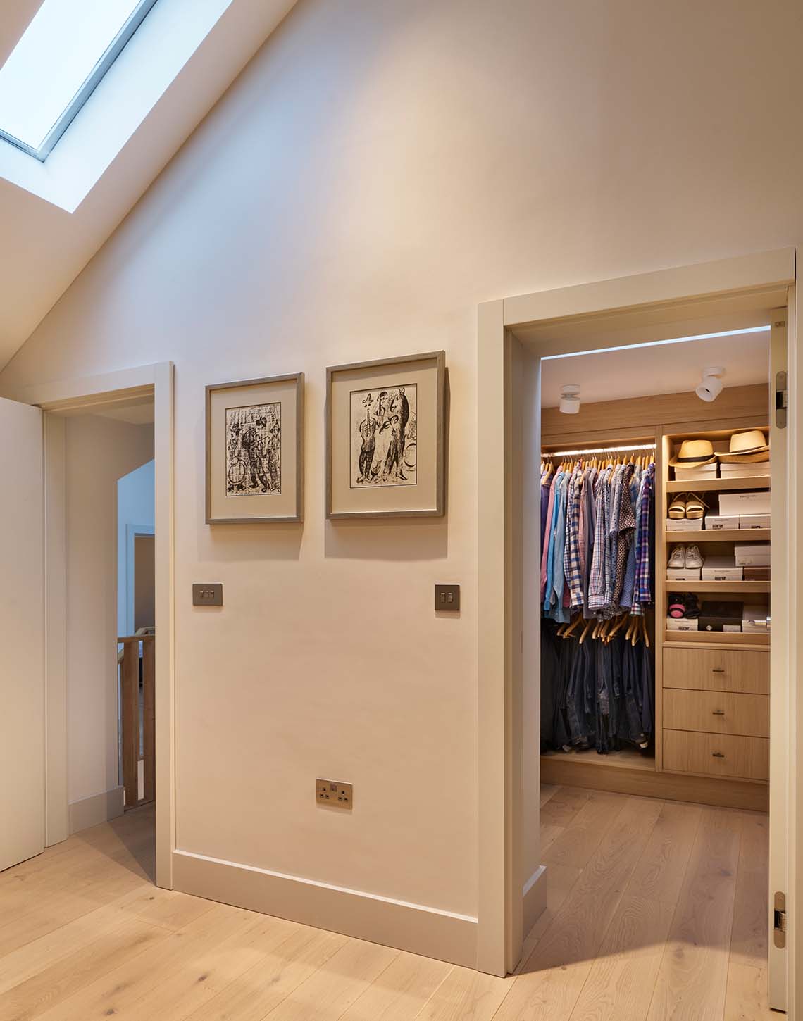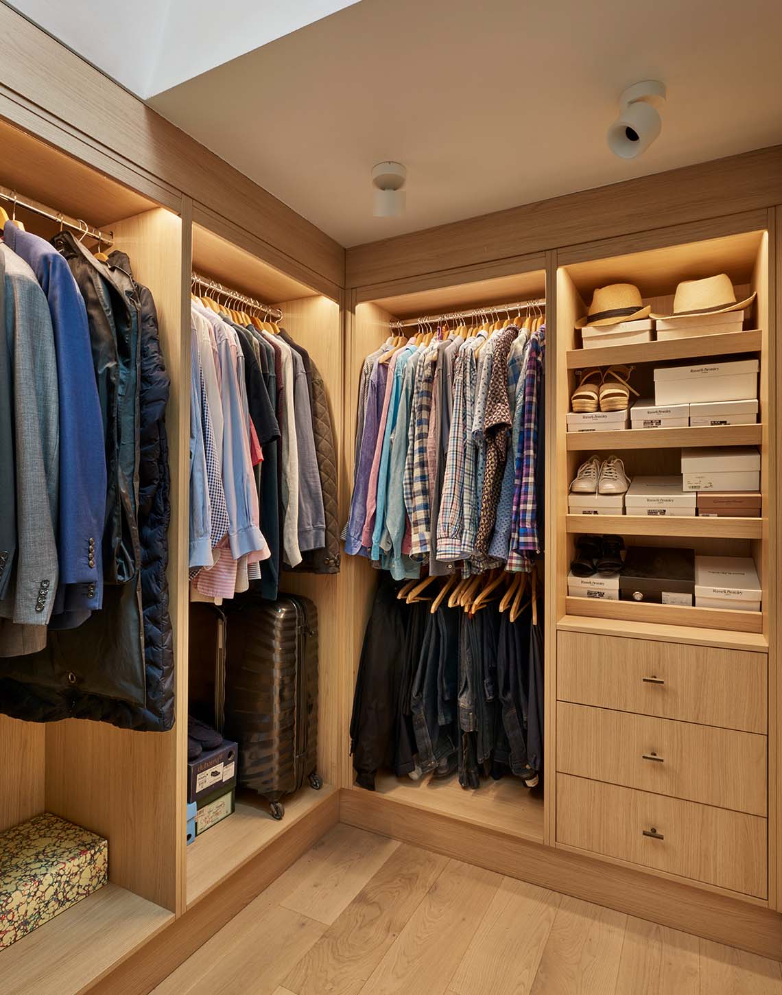 Internally, oak-lined cabinetry is softly illuminated, with hanging rails, drawers and shelving arranged for clarity and ease of use.