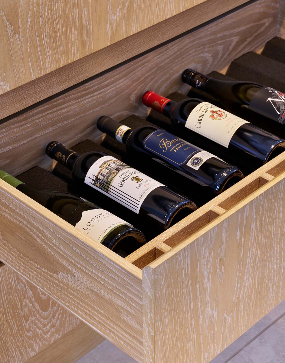 Wine storage is seamlessly integrated within the cabinetry, reflecting the same thoughtful approach to materiality and function.